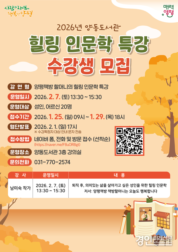 (경인미래신문=민경호 기자) 양평군(군수 전진선)은 새해를 맞아 양동도서관에서 오는 25일부터 29일까지 성인을 대상으로 한 ‘힐링 인문학 특강’ 수강생을 모집한다.