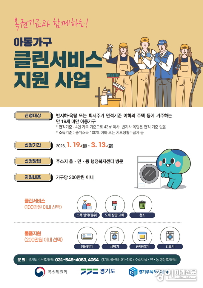 (경인미래신문=민경호 기자) 시흥시는 열악한 주거환경에 처한 아동가구의 주거환경 개선과 생활 안정을 위해 ‘2026년 아동가구 클린서비스 지원 사업’을 본격 추진한다.