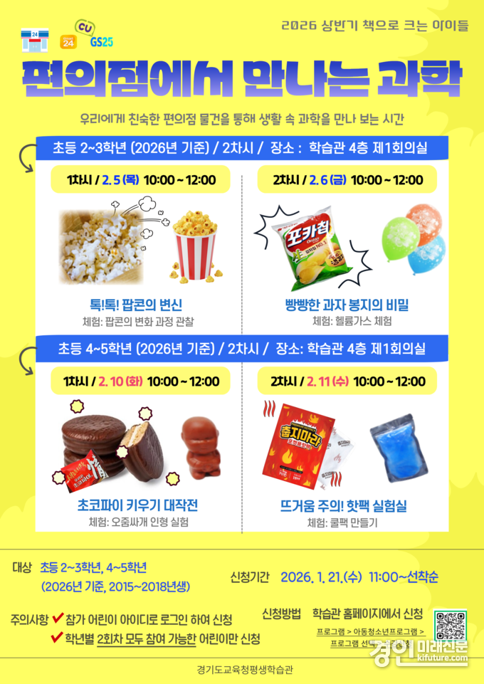 (경인미래신문=민경호 기자) 경기도교육청평생학습관(관장 류영신)이 초등학교 2~5학년을 대상으로‘책으로 크는 아이들, 편의점에서 만나는 과학’을 운영한다.
