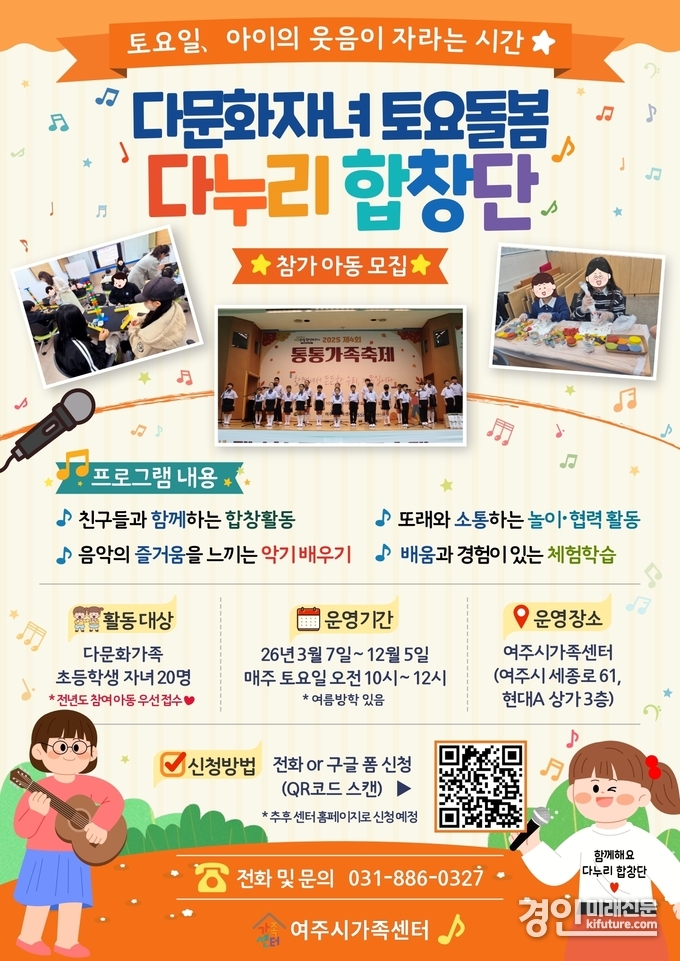 (경인미래신문=민경호 기자) 여주시가족센터(센터장 박지현)는 여주시의 지원을 받아 다문화가족 자녀를 대상으로 운영한 토요돌봄 프로그램 ‘다누리 합창단’의 2025년도 운영을 성공적으로 마무리하고 2026년도 프로그램 운영을 재개하며 참여 아동을 모집한다.