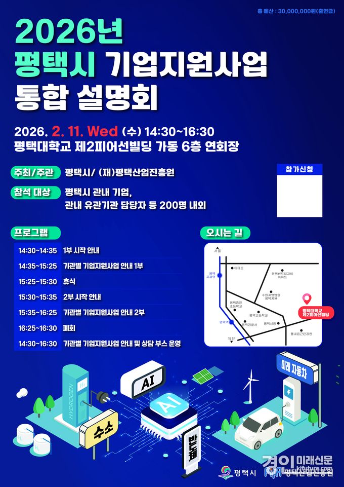 (경인미래신문=민경호 기자) 평택시(시장 정장선)가 평택산업진흥원(이하 진흥원)과 함께 오는 2월 11일 평택대학교 제2피어선빌딩 6층 대강당에서 ‘평택 중소기업 지원사업 설명회’(이하 지원사업 설명회)를 개최한다.