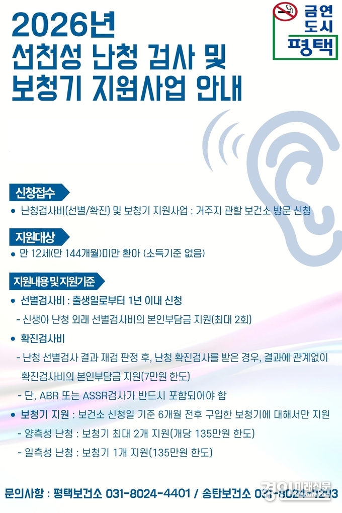 (경인미래신문=민경호 기자) 평택시(시장 정장선)는 성장기 아동의 청력 보호와 적기 치료 지원을 위해 보청기 지원사업의 대상을 기존 만 5세 미만에서 만 12세 미만까지 확대 시행한다고 밝혔다.