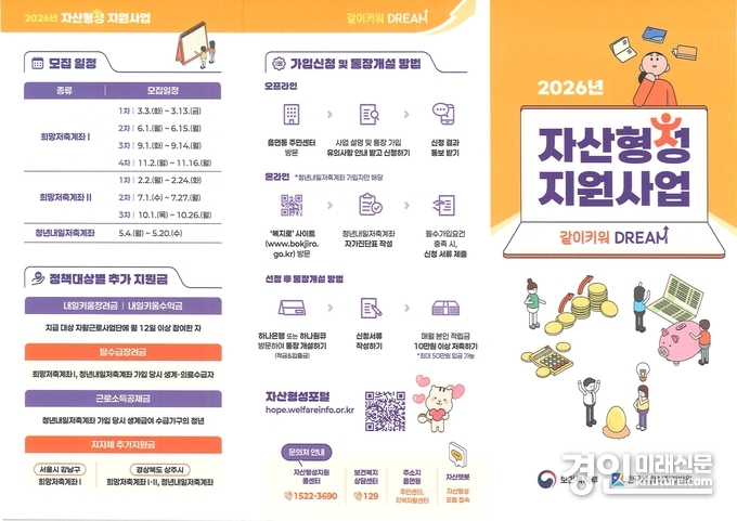 (경인미래신문=민경호 기자) 평택시(시장 정장선)와 평택지역자활센터(센터장 김양수)는 근로 사업소득이 있는 저소득 가구의 자립 기반 마련을 지원하기 위해 2026년 자산형성 지원사업 가입자를 모집한다고 전했다.