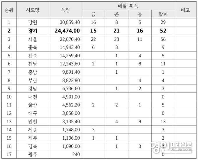 경기도는 이번 대회에서 총 3만 859.40점(금16, 은8, 동5)으로 종합 1위를 차지한 강원특별자치도에 경기도는 2만 4474.00점(금15, 은21, 동16)을 획득하며 이어 2위, 2만 2670.40점(금22, 은23, 동11)을 기록한 서울은 3위를 차지했다.