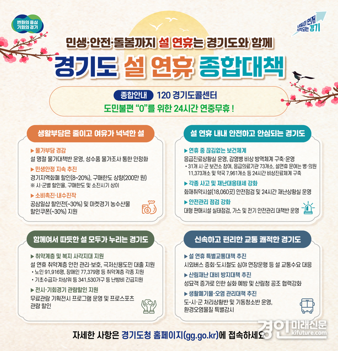 (경인미래신문=민경호 기자) 경기도가 도민들이 따뜻하고 편안한 명절을 보낼 수 있도록 ‘설 연휴 종합대책’을 추진한다.