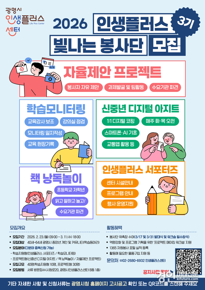 (경인미래신문=민경호 기자) 광명시(시장 박승원) 인생플러스센터가 ‘2026년 인생플러스 빛나는 봉사단’ 제3기 봉사자 40명을 2월 23일부터 3월 11일까지 모집한다.