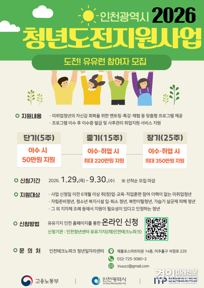 (경인미래신문=민경호 기자) 인천광역시(시장 유정복)는 청년의 경제활동 참여와 노동시장 진입을 지원하기 위해 ‘청년도전지원사업’ 참여자를 1월 29일부터 9월 30일까지 모집한다고 밝혔다.