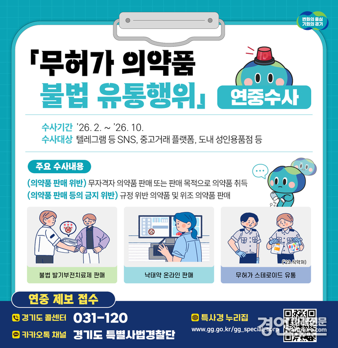 (경인미래신문=민경호 기자) 경기도 특별사법경찰단(특사경)이 비대면 유통망 확산을 틈타 급증하고 있는 무허가 전문의약품 불법 유통 근절을 위한 집중 수사에 나선다.