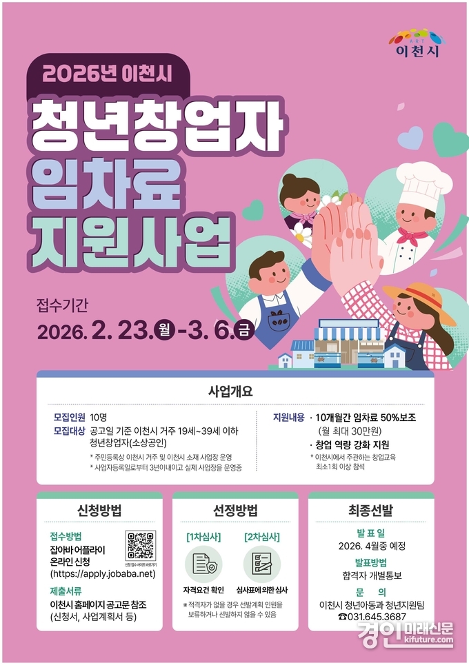 (경인미래신문=민경호 기자) 이천시(시장 김경희)는 청년창업자의 안정적인 지역 정착과 초기 경영부담 완화를 위해 ‘2026년 이천시 청년창업자 임차료 지원사업’을 추진한다.