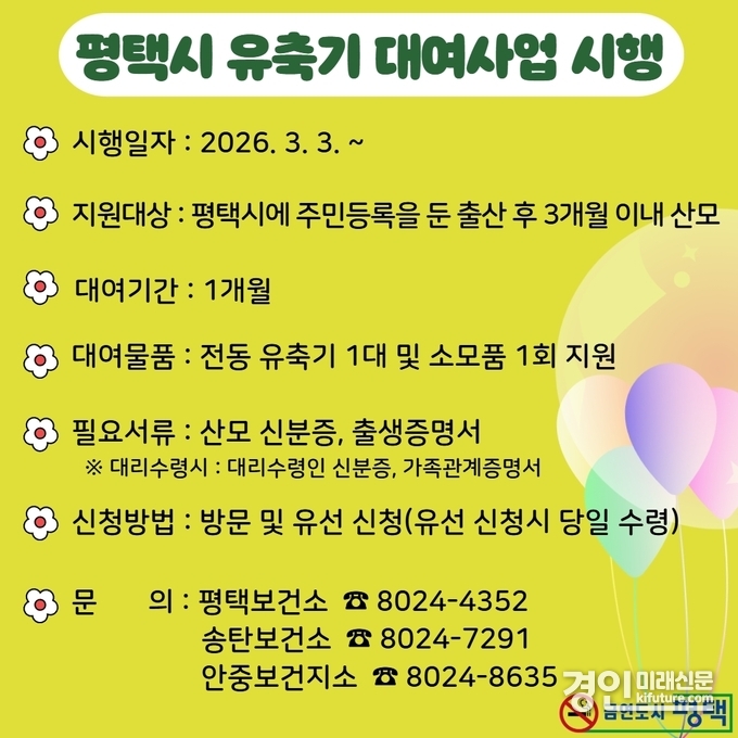 (경인미래신문=민경호 기자) 평택시(시장 정장선)는 출산 초기 산모의 경제적 부담을 덜고 안정적인 모유 수유 환경조성을 위해 오는 3월 3일부터 유축기 대여사업을 신규 시행한다고 밝혔다.