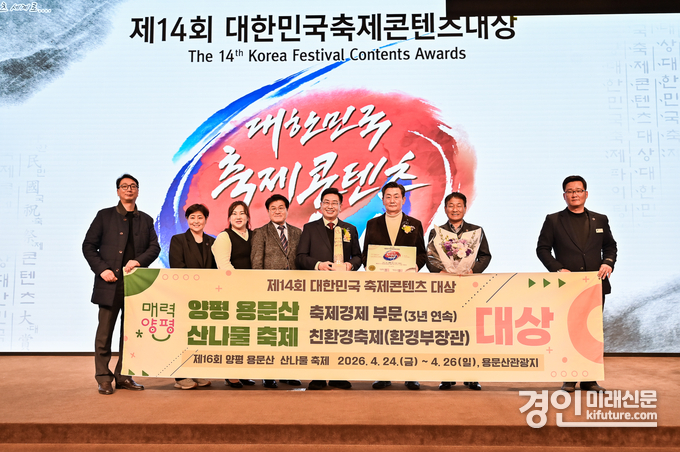 (경인미래신문=민경호 기자) 양평군(군수 전진선)은 지난 24일 용산기념관 내 피스앤파크컨벤션에서 개최된 ‘2026년 제14회 대한민국 축제 콘텐츠 대상’ 시상식에서 축제 경제 부문 3년 연속 대상 수상의 영예를 안았다.