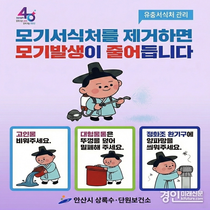 이미경 상록수보건소장은 “모기 서식처를 사전에 제거하면 발생을 크게 줄일 수 있다”며 “보건소의 철저한 방역에 시민들의 적극적인 협조가 더해진다면 더욱 쾌적하고 건강한 안산시를 만들 수 있을 것”이라고 말했다.