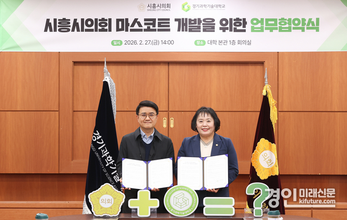 시흥시의회는 27일 경기과학기술대학교(이하 경기과기대) 본관에서 경기과기대와 '지역사회 상생 및 의회 마스코트 개발을 위한 업무협약(MOU)'을 체결했다.