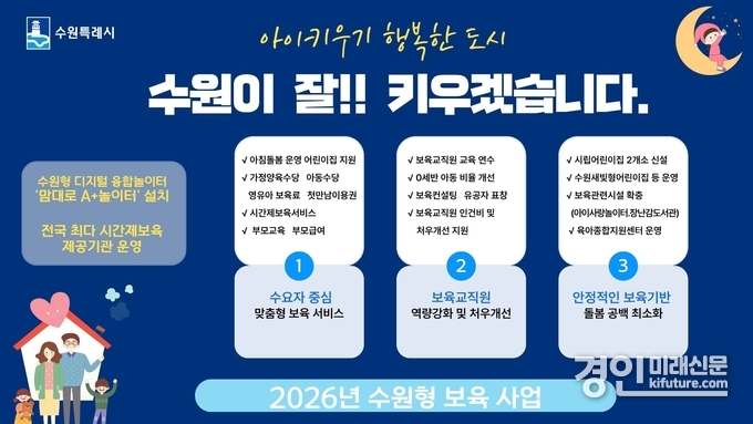 (경인미래신문=민경호 기자) ‘아이 키우기 행복한 도시’를 조성하고 있는 수원특례시(시장 이재준)가 ‘2026년 보육사업 시행계획’을 수립했다.