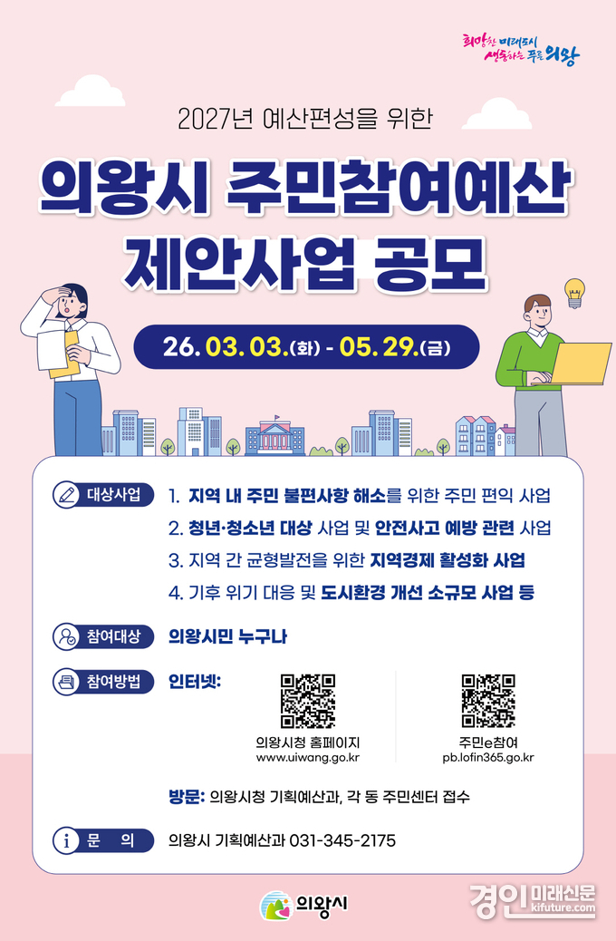(경인미래신문=민경호 기자) 의왕시(시장 김성제)가 시민이 예산 편성 과정에 직접 참여해 지역에 필요한 사업을 제안하는 ‘2026년 주민참여예산제’운영에 본격 나선다.