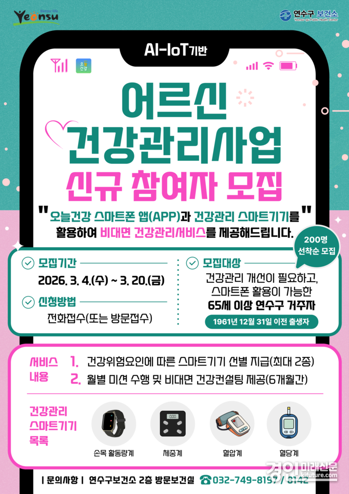 (경인미래신문=민경호 기자) 인천 연수구(구청장 이재호)가 65세 이상 어르신을 대상으로 인공지능 사물인터넷을 활용한 건강관리사업 신규 참여자를 4일부터 선착순 모집한다.