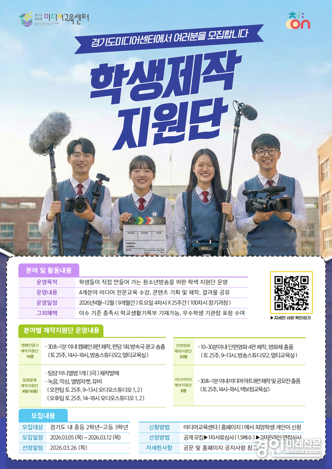 (경인미래신문=민경호 기자) 경기도교육청미디어교육센터(센터장 하미진)가 미디어 분야 진로를 희망하는 경기도 중·고등학생을 대상으로 ‘2026년 청소년방송 학생 제작지원단’을 모집한다.