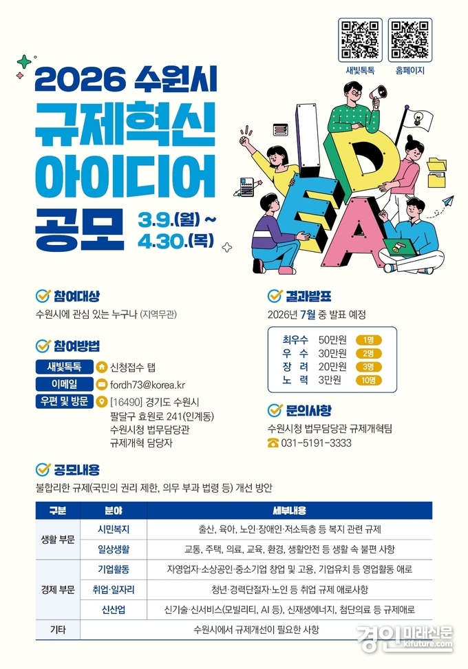 (경인미래신문=민경호 기자) 수원특례시(시장 이재준)가 오는 9일부터 4월 30일까지 ‘2026 규제혁신 아이디어’를 공모한다.