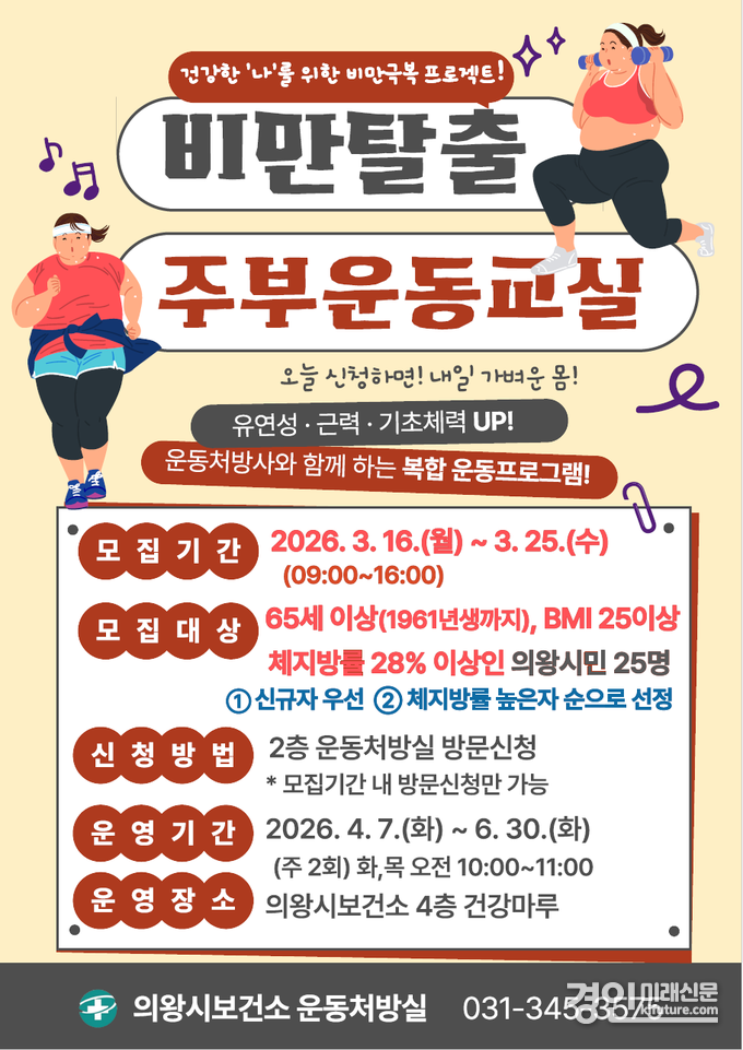 (경인미래신문=민경호 기자) 의왕시(시장 김성제) 보건소는 오는 16일부터 25일까지 “건강한 나를 위한 비만 극복 프로젝트 '비만 탈출 주부 운동 교실'” 참여자 25명을 모집한다.