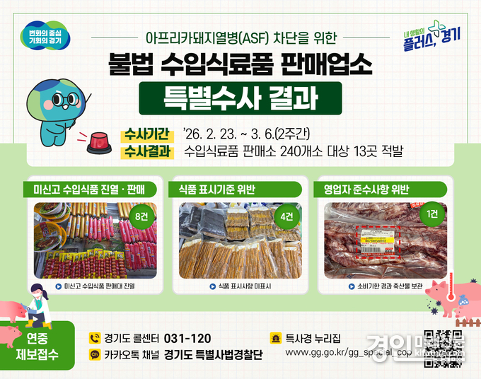(경인미래신문=민경호 기자) 경기도 특별사법경찰단은 아프리카돼지열병(ASF)의 국내 유입·확산 방지를 위해 수입식료품 판매업소를 수사한 결과, 미신고 수입식품 판매 등 총 13건을 적발했다고 11일 밝혔다.