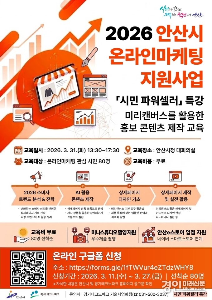 (경인미래신문=민경호 기자) 안산시(시장 이민근)는 급변하는 디지털 유통 환경에 대응해 시민들의 온라인 마케팅 역량 강화를 위한 ‘시민 파워셀러 특강’ 교육생을 모집한다고 12일 밝혔다.