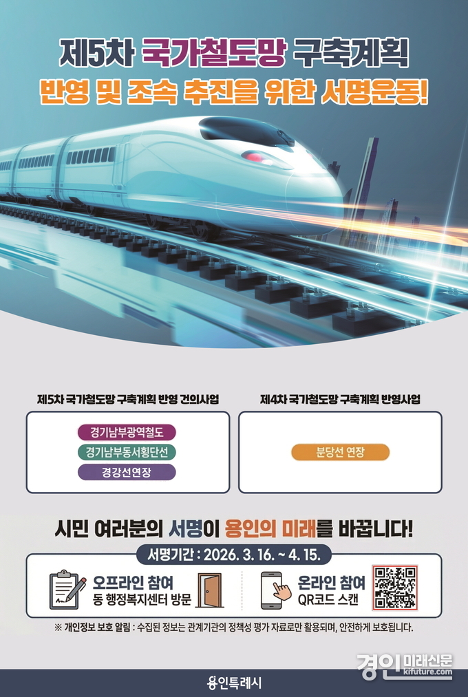 (경인미래신문=민경호 기자) 용인특례시(시장 이상일)는 16일부터 4월 15일까지 한 달간 용인시민과 국민 전체를 대상으로 ‘제5차 국가철도망 구축계획 반영 및 조속 추진을 위한 서명운동’을 펼친다고 15일 밝혔다.