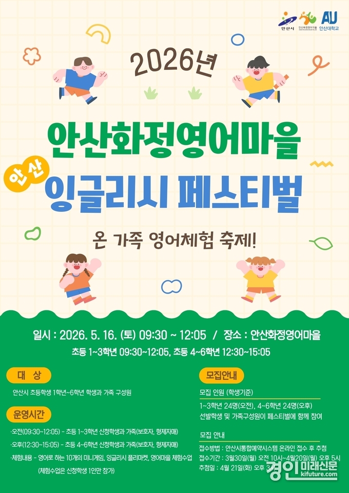 (경인미래신문=민경호 기자) 안산시(시장 이민근)가 설립하고 안산대학교(총장 윤동열)가 운영하는 안산화정영어마을은 ‘온 가족 영어체험 축제!’를 주제로 ‘안산 잉글리시 페스티벌’을 운영한다고 24일 밝혔다.