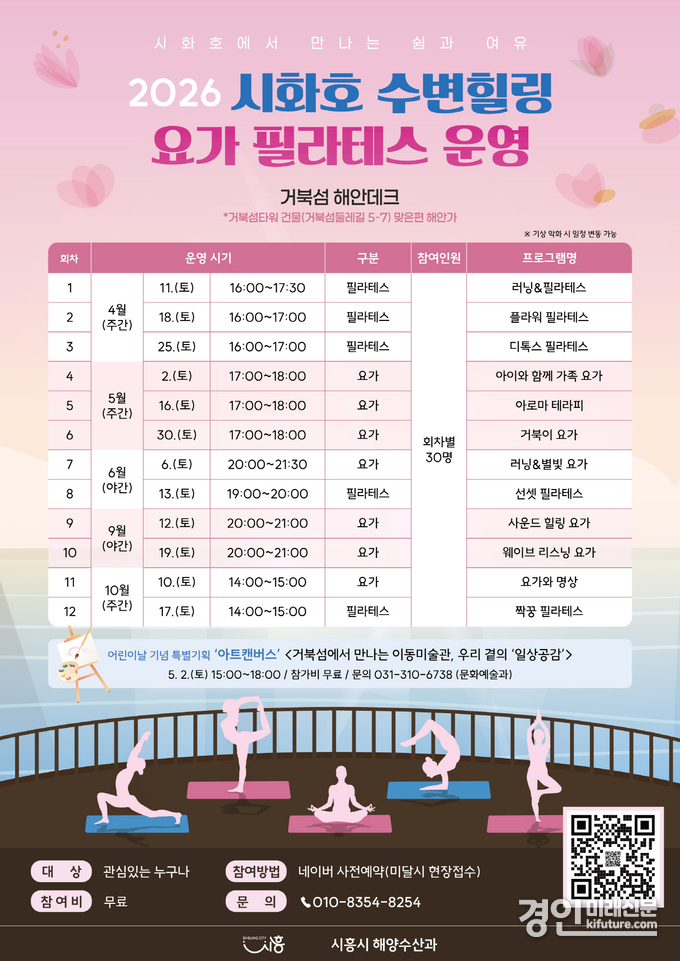 (경인미래신문=민경호 기자) 시흥시(시장 임병택)는 시화호 수변의 자연경관을 활용해 시민들에게 일상의 여유와 휴식을 제공하는 ‘시화호 수변 힐링 프로그램’을 오는 4월 11일부터 10월 17일까지 운영한다.