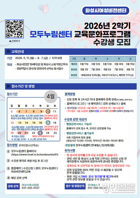 (경인미래신문=민경호 기자) (재)화성시여성가족청소년재단(대표이사 염미연) 여성비전센터는 2026년 2학기 교육문화 프로그램의 시민 수강생을 모집한다.