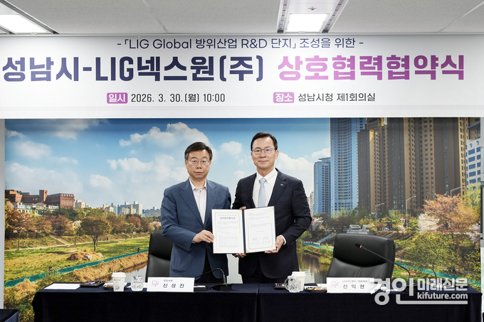 (경인미래신문=민경호 기자) 성남시(시장 신상진)와 LIG넥스원은 30일 방위산업 연구개발(R&D) 단지 조성을 위한 협약을 체결하고, 지역산업 경쟁력 제고와 지역사회 발전을 위해 협력해 나가기로 했다.