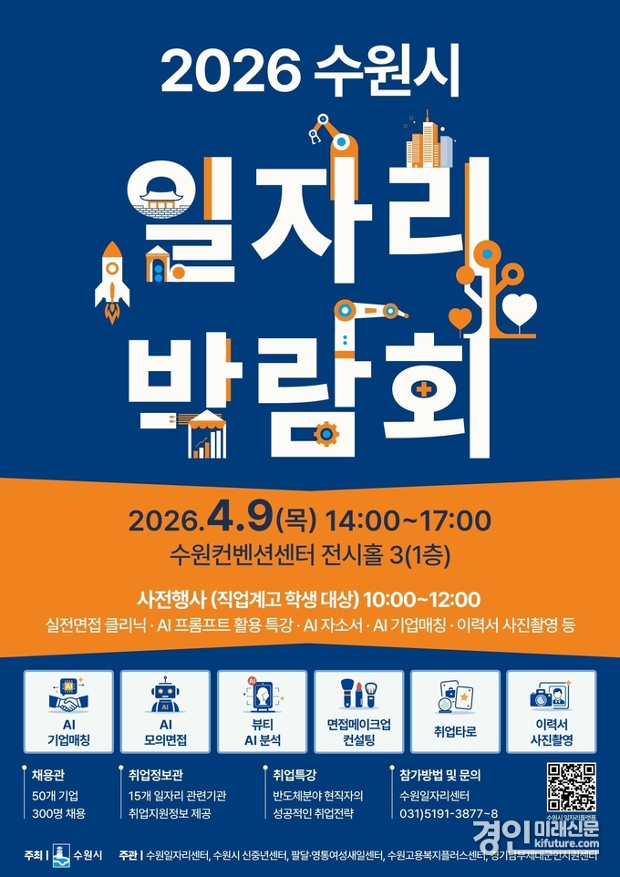 (경인미래신문=민경호 기자) 수원특례시(시장 이재준)는 오는 9일 오후 2시부터 5시까지 수원컨벤션센터 전시홀에서 ‘2026 수원시 일자리박람회’를 개최한다.