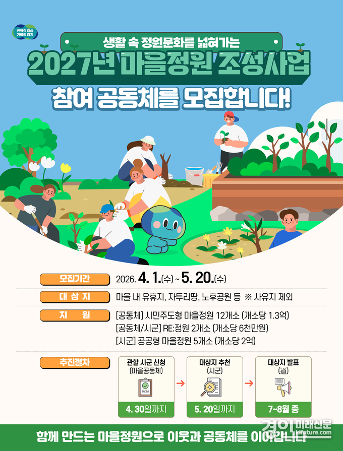 (경인미래신문=민경호 기자) 경기도는 마을 내 방치된 유휴 공간을 주민이 직접 정원으로 가꾸는 ‘2027년 마을정원 조성사업’ 대상지를 5월 20일까지 공개 모집한다.