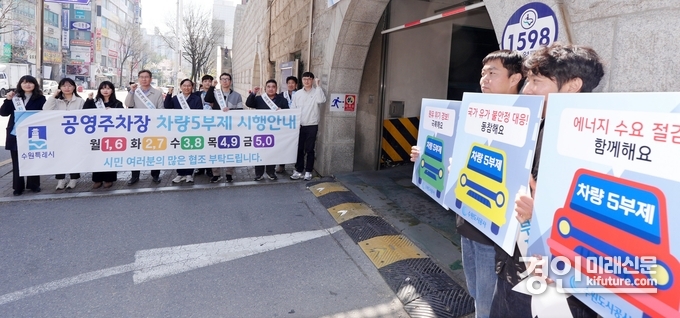 수원시는 8일 수원시청 본관 주차장, 수원시의회 지상 주차장, 수원시청 별관주차장에서 공공기관 2부제·공영주차장 5부제 알리는 캠페인을 펼쳤다.