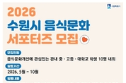 (경인미래신문=민경호 기자) 수원특례시(시장 이재준)는 ‘2026년 음식문화 서포터즈’로 활동할 중·고등·대학생을 4월 17일까지 모집한다. 음식문화 서포터즈는 단순 홍보를 넘어 시민이 참여하고 실천하는 활동으로 건강한 음식문화를 확산하는 역할을 맡는다. 온라인과 현장을 연계해 다양한 방식으로 시민과 소통하는 활동을 한다. ▲음식문화 개선, 수원음식축제 관련 온라인 홍보 콘텐츠 제작 ▲사회관계망서비스 공유 ▲수원음식축제 운영 지원 등 활동을 한다. 참여자는 활동 기간에 다양한 현장 경험을 쌓고 지역 축제 운영에도 참여한다. 음식문화 개선에 관심 있는 관내 중·고등·대학교 학생이 신청할 수 있다. 10명 내외를 선발한다. 선발된 서포터즈는 5월부터 10월까지 활동한다. 참여를 희망하는 학생은 수원시 홈페이지 ‘공고/고시/입법예고’ 게시판에서 신청서를 내려받아 작성한 후 전자우편(bbgg1231@korea.kr)으로 제출하면 된다. 자세한 사항은 공고문에서 확인할 수 있다. 활동자에게는 위촉장과 활동 인증서를 발급하고 우수 활동자에게는 수원특례시장 표창을 수여한다. 자원봉사 시간도 부여할 예정이다. 수원시 관계자는 “서포터즈 활동이 시민이 참여하는 음식문화 개선