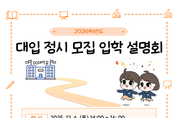 (경인미래신문=민경호 기자) 인천광역시교육감(교육감 도성훈)은 오는 6일 관내 대입 수험생과 학부모를 대상으로 2026학년도 대입 정시모집 입학설명회를 실시한다. 설명회는 인천시교육청 정보센터 대회의실에서 오후 2시부터 약 두 시간 동안 진행되며 EBS 진로진학대표강사가 강연을 맡아 정시모집 지원 전략과 정보를 제공한다. 참석자들에게는 인천진로진학지원단에서 제작한 ‘2026학년도 정시모집파노라마’도 배포한다. 인천시교육청 관계자는 “수능 성적 통지 후 수험생들에게 꼭 필요한 정시 지원 핵심 정보를 제공하고자 설명회를 마련했다”며 “정시모집을 준비하는 고등학생, 검정고시 응시자, 졸업생 모두에게 유익한 시간이 될 것”이라고 말했다.