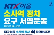 (경인미래신문=민경호 기자) 부천시는 서해선 KTX-이음 열차의 소사역 정차를 추진하기 위해 10만 서명운동을 시작했다. 이번 서명운동은 12월 19일까지 진행되며 관내 시민과 인천·서울 서남권 주민의 광역철도 접근성을 높이고, 지역 산업과 관광 활성화를 통한 경제적 효과를 목표로 추진된다. 온라인 서명운동은 큐알(QR)코드와 부천시 홈페이지를 통해 참여할 수 있다. 오프라인 서명운동은 시청과 원미구·소사구·오정구청, 각 동 행정복지센터 민원실을 비롯해 소사역, 부천시청역 등 주요 전철역과 아파트 단지 등 시민 접근이 쉬운 장소에서 진행된다. 이와 함께 시는 이번 서명운동에 시민과 지역 단체, 학교 등 다양한 주체가 참여할 수 있도록 적극적인 홍보활동도 병행할 계획이다. 특히 ‘서해선 KTX-이음 소사역 정차’의 필요성과 지역 발전 효과를 널리 알리기 위해 소셜네트워크서비스(SNS), 지역 축제 현장 캠페인 등을 통해 적극적으로 홍보할 예정이다. 조용익 부천시장은 “KTX-이음 소사역 정차는 단순한 교통 개선을 넘어, 서해선 시대에 부천이 수도권 서남부의 중심으로 도약할 수 있는 계기”라며 “시민의 서명 하나하나가 소중한 힘이 되는 만큼 많은 참여를 바란다”