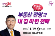 (경인미래신문=민경호 기자) 성남시(시장 신상진)는 오는 19일 오후 3시 50분~5시 30분 시청 1층 온누리에서 ‘부동산 전망과 내 집 마련 전략’을 주제로 한 희망성남 토크콘서트 8강을 연다. 이번 초빙 강사는 고종완 한국자산관리연구원장이다. 고종완 원장은 변화하는 부동산시장 속에서 시민들이 알아야 할 부동산 정책, 향후 시장 전망, 내 집 마련 전략 등에 관해 강연한다. 고 원장은 한양대학교 도시공학박사로 건국대학교 부동산대학원 초빙교수, 한양대학교 부동산융합대학원 특임교수, LH자문위원 등을 역임했다. 현재 국민연금공단 대체투자위원회 위원, 금융위원회 금융발전심의회 위원 등으로 활동하고 있다. 저서로 ‘살 집 팔 집’, ‘대한민국 부동산 전쟁’ 등이 있다. 강연은 무료로 진행되며, 성남시 평생학습 통합 플랫폼 ‘배움숲’ 홈페이지를 통해 선착순 600명까지 신청할 수 있다. 성남시는 경제 특강 2탄으로 오는 12월 9일 김광석 한국경제산업연구원 경제연구실장을 초빙해 희망성남 토크콘서트 올해 마지막 강연(9강)을 연다.