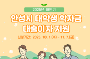 (경인미래신문=민경호 기자) 안성시(김보라 시장)는 오는 11월 7일까지 ‘2025년도 하반기 안성시 대학생 학자금 대출이자’ 지원 신청을 받는다. 지원 대상은 공고일(2025. 10. 1.)기준으로 안성시에 주민등록 주소를 두고 재학(휴학 포함)중인 대학(원) 재학생(휴학생)이다. 지원 대상자로 선정되면 대상자가 한국장학재단에서 대출받은 학자금에 대한 2025년 상반기(1월~6월) 발생 이자를 안성시가 지급하게 된다. 지급은 대출 계좌 원리금에서 차감하는 방식으로 진행되며 지원 내역은 12월 지급이 확정된 시점에 한국장학재단 인터넷 홈페이지에서 확인할 수 있다. 신청 방법은 주소지 읍·면·동 행정복지센터 또는 안성시청(미래교육과)으로 방문해 접수하면 된다. 안성시 관계자는 “학자금 대출이자 지원 사업을 통해 대학생들의 학업 부담을 완화하고 학업에 전념할 수 있는 환경을 조성하는데 도움이 되길 바란다”고 전했다. 기타 자세한 사항은 안성시청 미래교육과 및 읍·면·동 행정복지센터를 통해 확인할 수 있다.