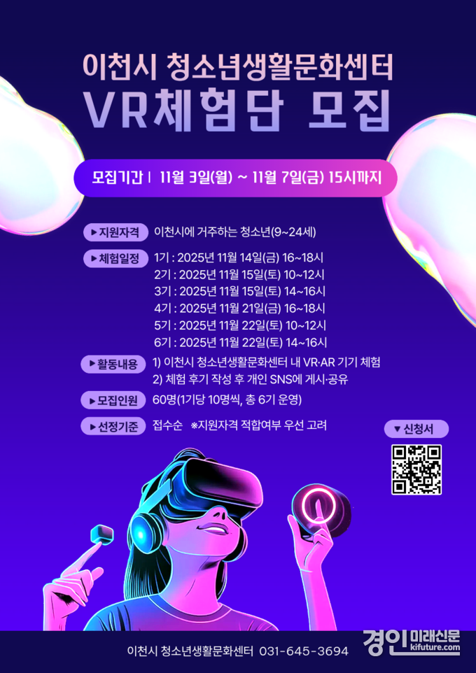 이번 체험단은 11월 3일부터 7일까지 이천시청 누리집을 참고해 온라인 신청서를 제출하여 신청할 수 있으며 가상현실(VR)·증강현실(AR) 등 첨단기술 분야에 관심이 많은 이천시 청소년이면 누구나 참여할 수 있다.