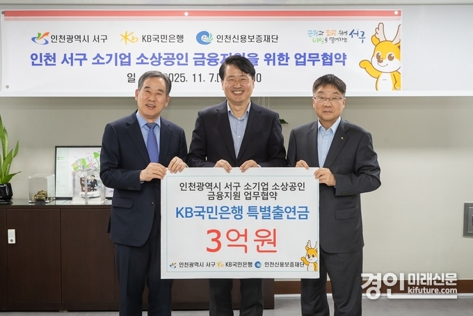 (경인미래신문=민경호 기자) 인천 서구(구청장 강범석)는 지난 7일 국민은행, 인천신용보증재단과 함께 45억원 규모의 ‘소기업·소상공인을 위한 금융지원 협약보증’ 업무 협약을 체결했다고 밝혔다.
