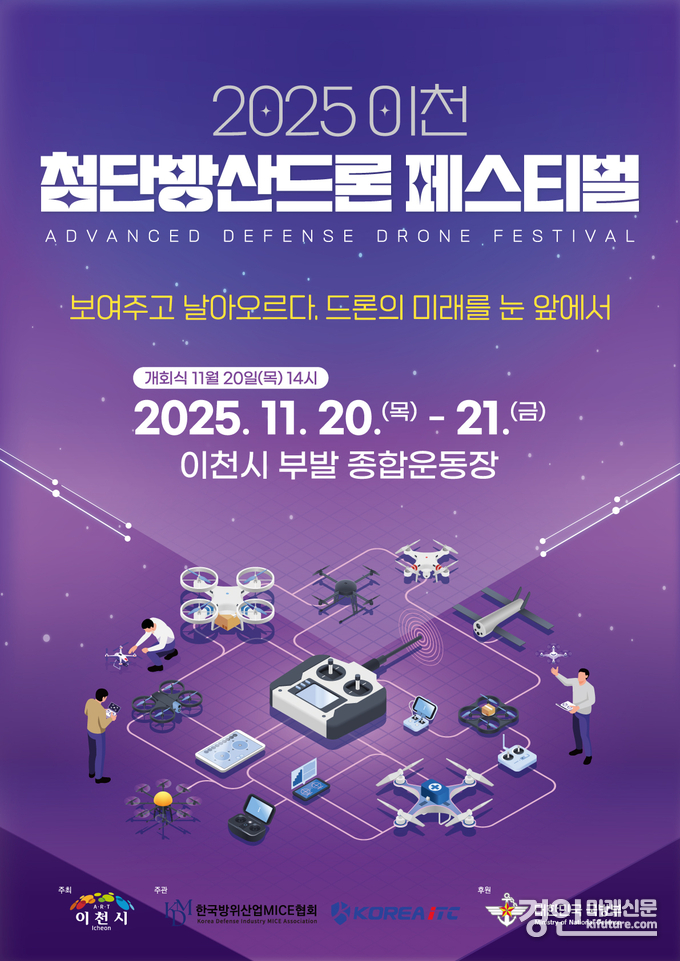 이천시(시장 김경희)는 오는 20일부터 21일까지 2일간 부발읍 종합운동장 일원에서 ‘2025 이천 첨단방산드론 페스티벌’을 개최한다.