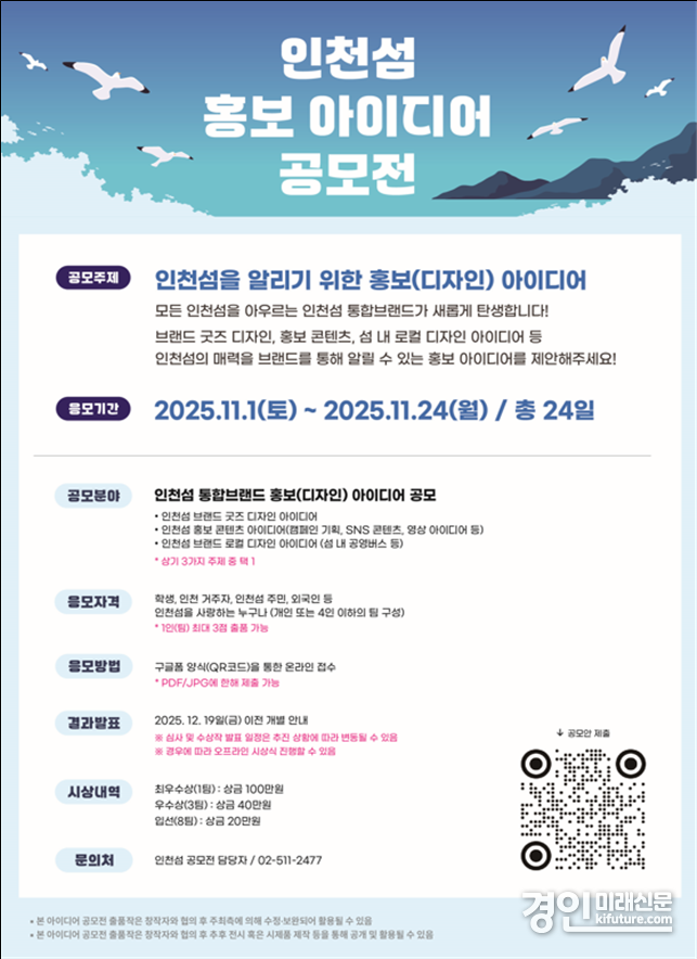 (경인미래신문=민경호 기자) 인천광역시(시장 유정복)는 인천의 섬들이 지닌 고유한 매력과 이야기를 시민들의 창의적인 시각으로 새롭게 담아내기 위해 ‘인천섬 홍보 아이디어 공모전’을 개최한다고 밝혔다.