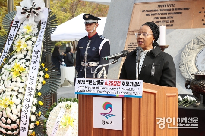 신디스와 은톰볼리모 음쿠쿠 남아공 대사는 추도사에서 “남아공 참전용사들을 위한 75주년 추모기념식을 정성껏 준비해주신 평택시와 6·25 참전유공자회 그리고 모든 분께 깊은 감사를 드리며 이번 기념식은 세계 평화와 정의를 추구하는 남아공 외교정책의 비전을 보여주는 행사로 남아공은 앞으로도 평화와 번영을 위한 모든 국제적 역할을 하겠다”라고 말했다.