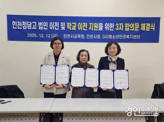 (경인미래신문=민경호 기자) 인천광역시교육청(교육감 도성훈)은 지난 12일 인천시청, 사단법인 청소년인권복지센터 내일과 함께 인천청담고등학교의 법인 이전 및 학교 이전 지원을 위한 3자 합의를 체결했다.