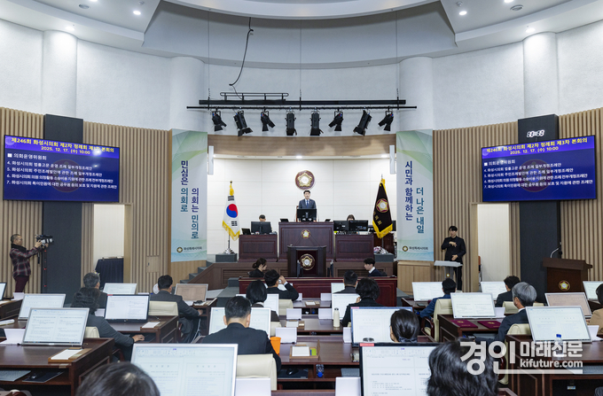 (경인미래신문=민경호 기자) 화성특례시의회(의장 배정수)는 17일 의회 본회의장에서 제246회 제2차 정례회 제3차 본회의를 개의해 5분발언을 청취하고 각 상임위원회 및 예산결산특별위원회 심사 안건과 2025년도 행정사무감사 결과보고서 채택의 건 등을 심의·의결했다.