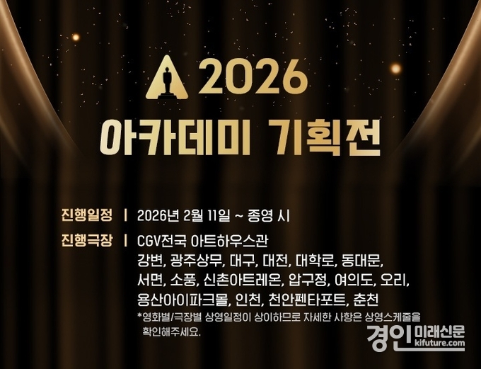‘2026 아카데미 기획전’은 CGV강변, 광주상무, 대구, 대전, 대학로, 동대문, 서면, 소풍, 신촌아트레온, 압구정, 여의도, 오리, 용산아이파크몰, 인천, 천안펜타포트, 춘천 등 전국 16개 극장에서 선보일 예정이다.