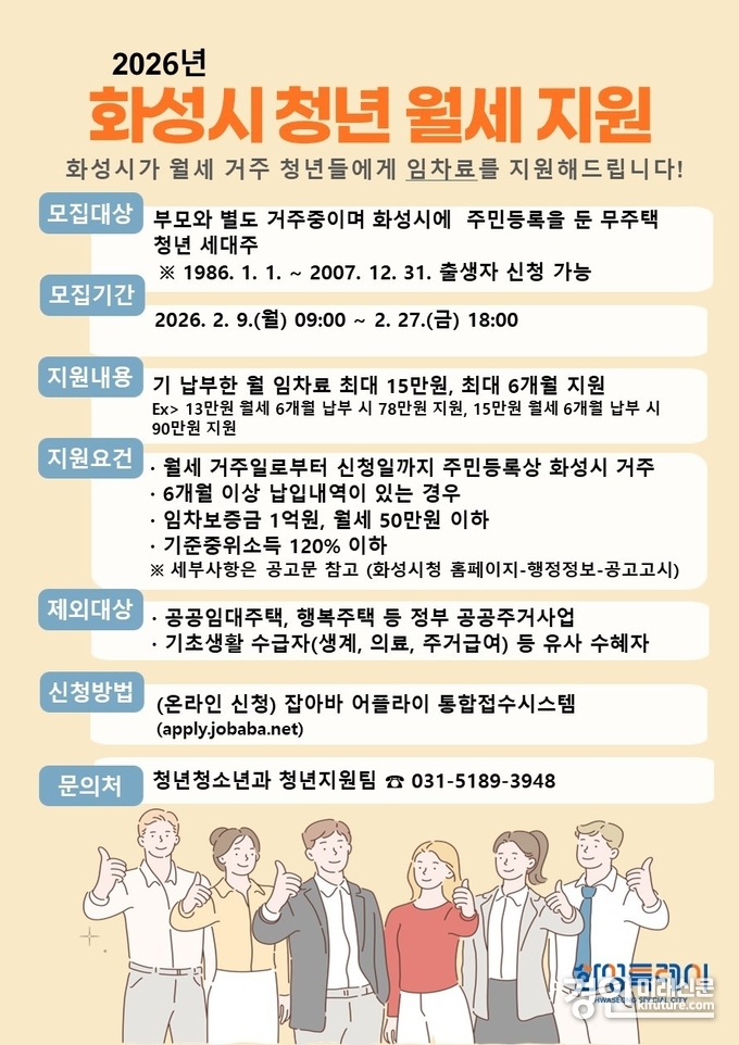 (경인미래신문=민경호 기자) 화성특례시(시장 정명근)가 청년들의 주거비 부담을 덜고 안정적인 주거 생활을 지원하기 위해 2월 9일부터 2월 27일까지 ‘청년 월세 지원 사업’ 신청자를 모집한다고 밝혔다.