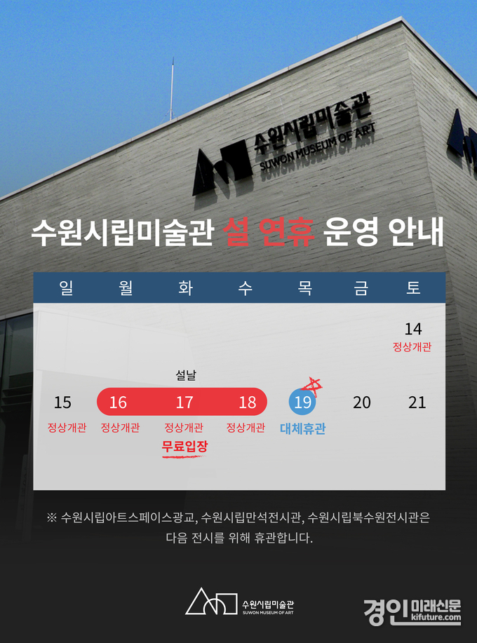 수원시립미술관 행궁 본관 외 수원시립아트스페이스광교, 수원시립만석전시관, 수원시립북수원전시관은 설 연휴 기간 휴관한다.
