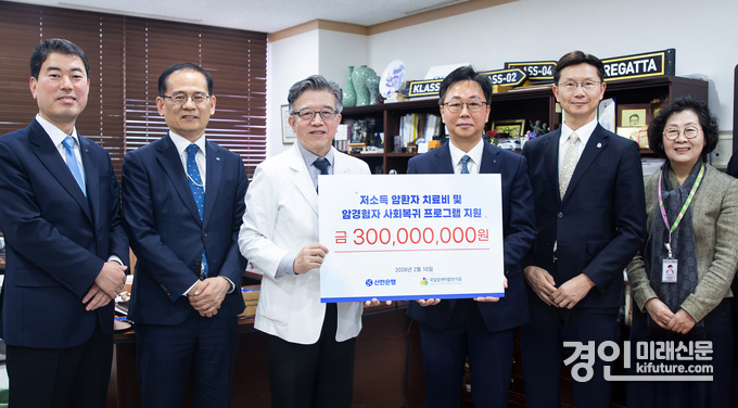 (경인미래신문=민경호 기자) 신한은행(은행장 정상혁)은 지난 10일 경기도 고양시 일산동구 소재 국립암센터에서 이봉재 신한은행 기관·제휴영업그룹장과 양한광 국립암센터 원장이 참석한 가운데 후원금 전달식을 진행했다.