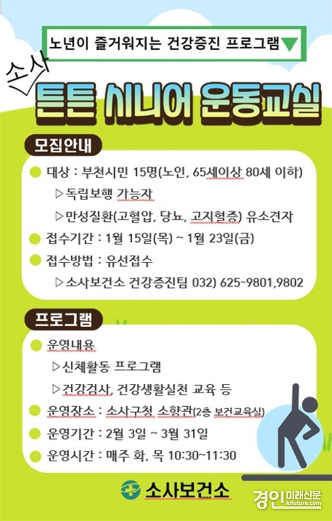 운동교실은 별도의 참가비 없이 참여할 수 있다. 2기는 4월부터 5월까지 추가 운영할 예정이며 참여를 원하는 노인은 소사보건소 건강증진팀으로 문의하거나 부천시 홈페이지를 통해 신청하면 된다.